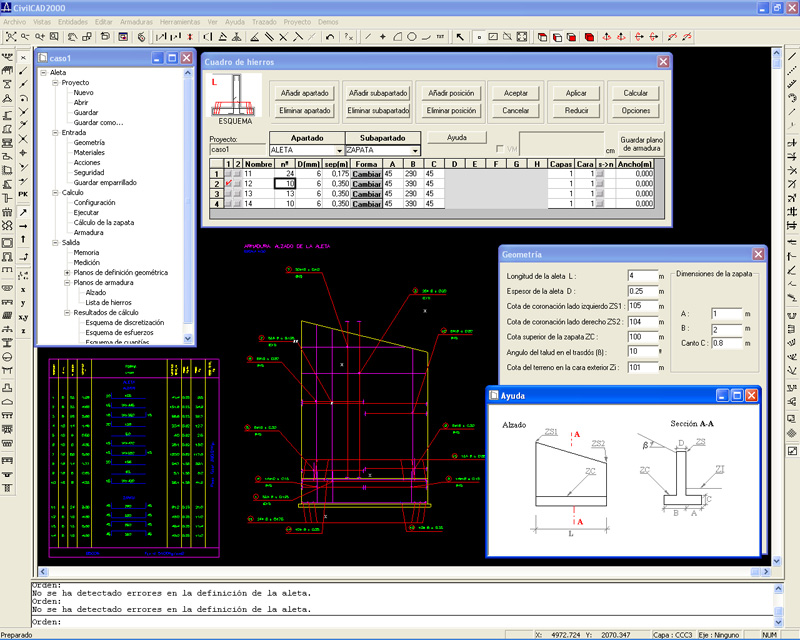 El usuario obtiene mapas de esfuerzos longitudinales y transversales en el alzado de la aleta, esquemas de cuantías de armadura vertical y horizontal así como las tensiones en el terreno bajo la zapata.