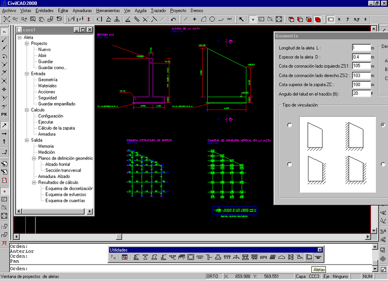 Aplicación: Aletas de contención de tierras de hormigón armado. Zapata con forma rectangular en planta y alzado con coronación horizontal o inclinada. Posibilidad de empotrar ninguno, uno o los dos lados del alzado. Tierras en trasdós horizontales o con talud inclinado. Acciones consideradas: peso propio de hormigón y de las tierras, empuje de tierras en trasdós, sobrecarga en trasdós.