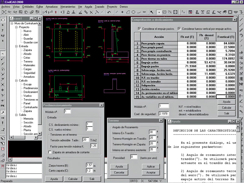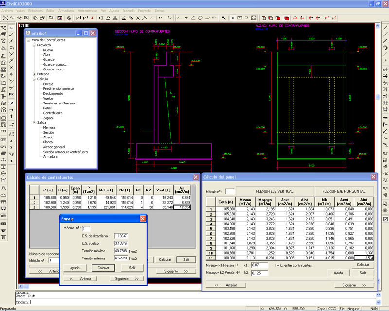 Cálculo: El programa realiza las comprobaciones de los estados límite de deslizamiento y vuelco y obtiene las tensiones en el terreno bajo la zapata para las distintas combinaciones de carga. El usuario puede analizar el panel frente a flexión de eje vertical y flexión de eje horizontal, obteniendo cuantías de armado a flexión y a cortante. También los nervios de los contrafuertes son calculados a flexión y a cortante. Se obtienen los anchos eficaces en las secciones a diferentes alturas y se resuelve la comprobación no lineal a flexión de la sección en T. El programa permite también estudiar el comportamiento a flexión y a cortante de la zapata, tanto en puntera como en el talón.