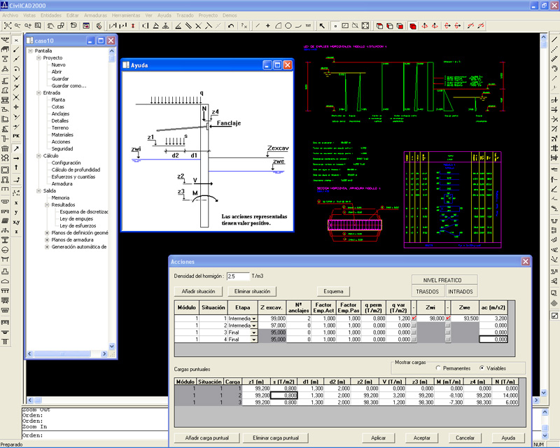 Aplicación: En este módulo, CivilCAD2000 permite al usuario proyectar una serie de pantallas adyacentes de hormigón armado con trazado cualquiera en planta. Las líneas de coronación y de excavación son variables longitudinalmente. Opcionalmente puede disponerse anclajes al terreno en cualquier cota de la pantalla. El terreno puede tener cualquier número de capas en trasdós e intradós. Las cargas que se consideran son: el empuje de tierras, la acción de una sobrecarga permanente y una variable en trasdós de la pantalla, la presencia de un nivel freático, la actuación de una serie de cargas puntuales en una cota cualquiera de la pantalla constituidas por un axil, un cortante, un flector y una sobrecarga en faja y la acción sísmica.