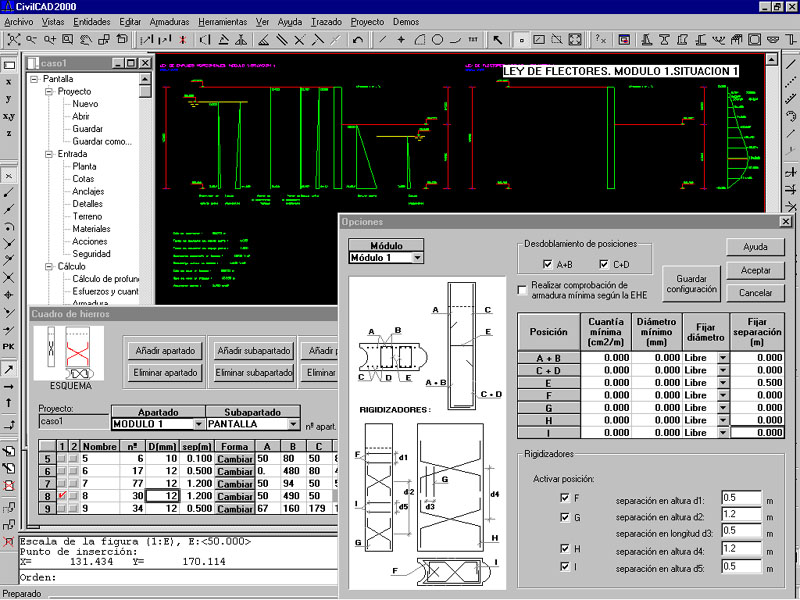 Cálculo: El programa permite calcular la profundidad de la pantalla que equilibra las acciones existentes. Un potente diálogo permite analizar el comportamiento de la pantalla en el cálculo de la profundidad de excavación. El usuario obtiene a continuación los esfuerzos y cuantías resultantes de las comprobaciones a flexión y a cortante. Todos los cálculos anteriores son realizados siguiendo las especificaciones establecidas en la normativa EHE. El despiece del armado de la estructura es obtenido de forma automática. El cálculo de las armaduras es configurable por el usuario. El programa obtiene las cuantías mínimas establecidas por la EHE. El diálogo del cuadro de hierros ofrece un cómodo y potente interface al usuario para definir los detalles y completar el despiece según sus propios criterios.