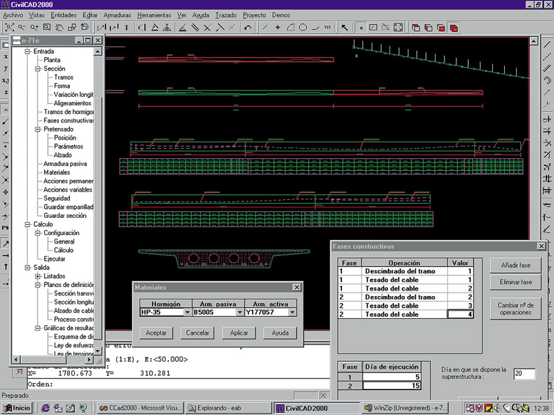 Aplicación: En este módulo, CivilCAD2000 permite al usuario proyectar puentes de hormigón postesado construidos por fases con una sección transversal de forma cualquiera que puede ser variable a lo largo del puente. Opcionalmente pueden definirse aligeramientos de sección circular o poligonal. La directriz del tablero puede tener forma cualquiera y sobre ella puede definirse cualquier tipo y número de coacciones. El proceso constructivo del puente se define dando la secuencia de operaciones de hormigonado y tesado que se ha previsto para la construcción del tablero.
