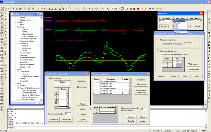 Cálculo: CivilCAD2000 discretiza automáticamente el tablero y realiza el cálculo de esfuerzos para cada una de las fases constructivas y acciones sobre el puente terminado. A continuación obtiene las envolventes para los estados límite último y de servicio en sus distintas combinaciones de carga. El usuario puede obtener las tensiones máximas y mínimas que se producen a lo largo del tablero en los distintos instantes de la historia constructiva del puente. El programa permite asimismo desarrollar la comprobación a rotura por flexión, proporcionando armaduras de cálculo al proyectista.