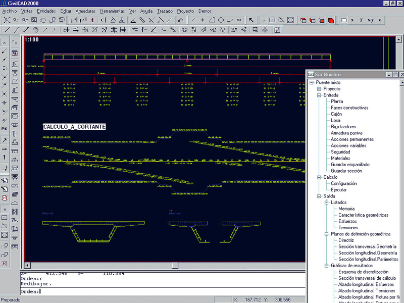 Cálculo: Basado en los criterios de la RPX-95. Opciones diversas para el cálculo de esfuerzos: fisuración de la losa, efectos diferidos, acción de temperatura y retracción, etc. Cálculo no lineal de las tensiones por flexión, cortante y torsión, considerando el proceso constructivo. Obtención de flector, cortante y torsor últimos.