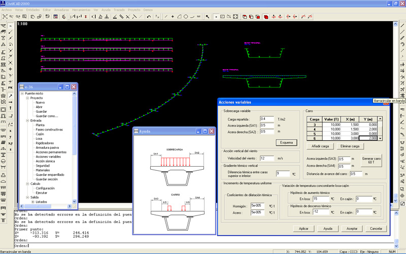 Aplicación: Sección transversal constituida por un cajón metálico y una losa de hormigón. Posible variación longitudinal de la sección. Rigidizadores longitudinales opcionales en almas y ala. Trazado en planta recto o curvo. Libertad para definir el proceso constructivo y disponer o retirar apeos provisionales. Cargas: peso propio, superestructura, sobrecarga repartida, carro de cargas puntuales, gradiente térmico, descenso de apoyos, aumento de temperatura en losa y cajón, retracción. Caracterización de los materiales por sus diagramas tensión-deformación.