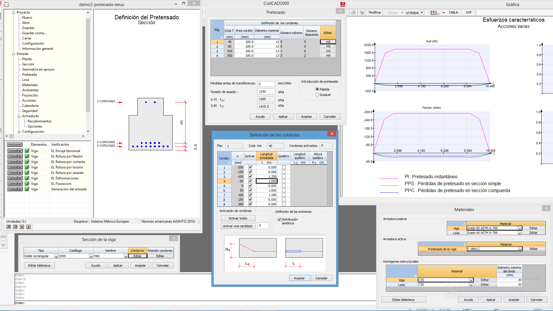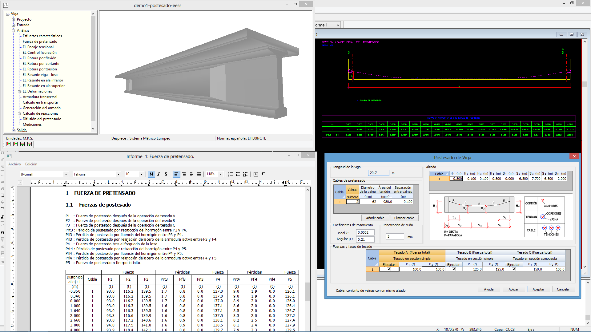 La viga puede ser armada, pretesada o postesada, o pretesada y postesada al mismo tiempo. En el caso de definir un postesado, para cada cable se permite hasta un total de 3 tipos de operaciones de tesado (todas las operaciones de tesado son opcionales):