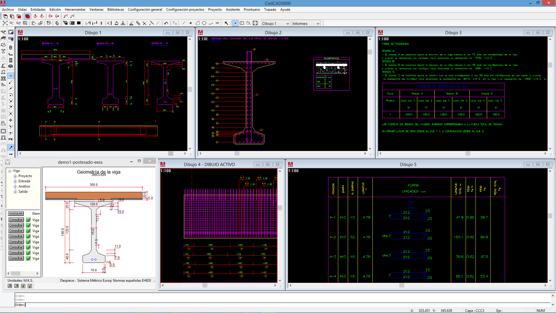 El Módulo Viga prefabricada de CivilCAD3000 permite proyectar una viga biapoyada. El usuario puede asignar a la viga una de las distintas secciones tipo con las que se trabaja habitualmente y que vienen definidas en la biblioteca de secciones, o bien definir un tipo de sección propio. Las vigas pueden tener forma rectangular, en T invertida, en doble T o bien forma cualquiera definida por puntos.