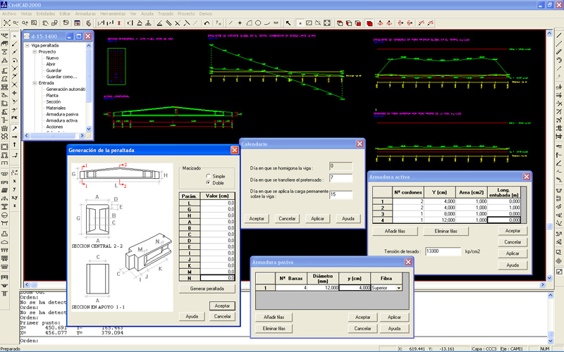 Cálculo: CivilCAD2000 desarrolla el cálculo de esfuerzos asociado a cada acción. El programa obtiene los esfuerzos, reacciones y desplazamientos mayorados para cada tipo de carga y genera las envolventes para cada instante del proceso constructivo en los estados límite último y de servicio. El proceso seguido se ajusta a las especificaciones establecidas en las normas EHE/IAP.